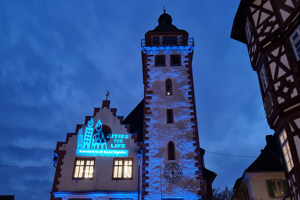 Mosbach beteiligt sich am Aktionstag "Cities for Life‘" und setzt mit der Illumination des Rathauses ein Zeichen für Menschenrechte und die Abschaffung der Todesstrafe.