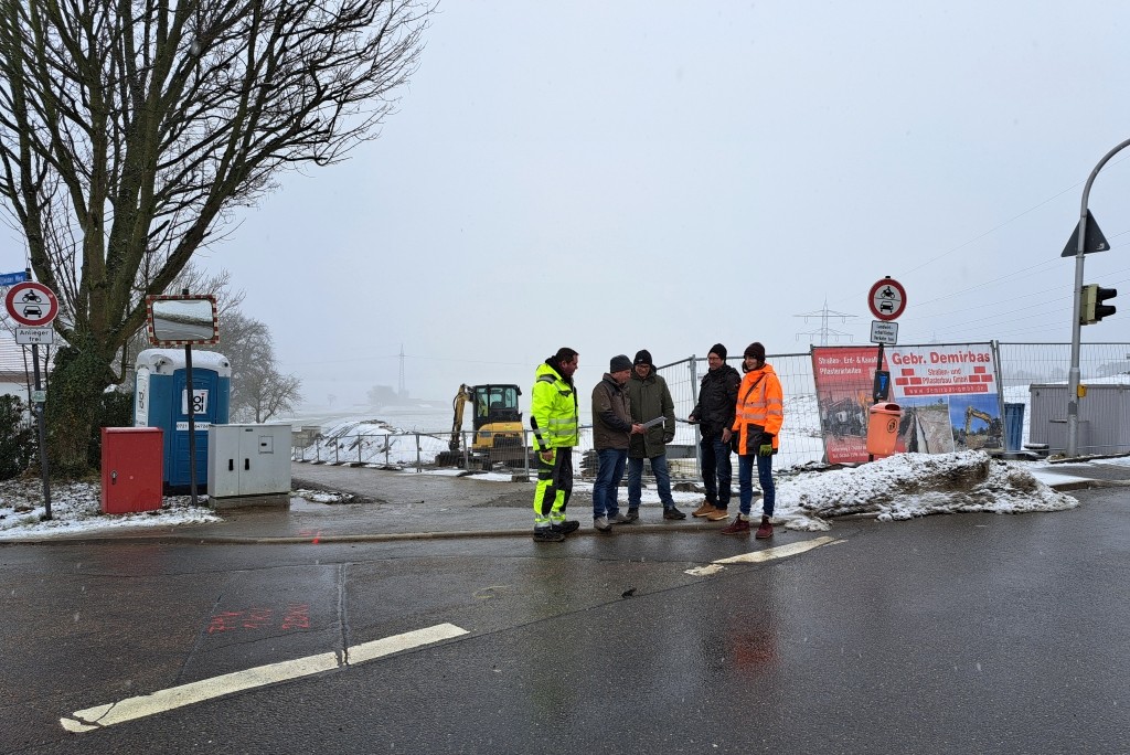 Austausch zur Baumaßnahme vor Ort: Vertretende der Baufirma Demirbas GmbH, BIOPLAN Ingenieurgesellschaft mbH und städtische Tiefbauabteilung besprechen im Hardhofweg die anstehenden Maßnahmen, (c) Stadt Mosbach