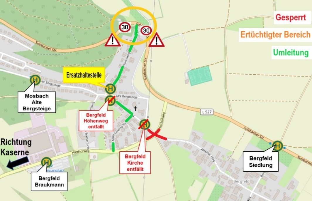 Für den Busverkehr in der Alten Bergsteige wurde eine Lösung gefunden, bei dem fast alle Haltestellen bedient werden können. Die Busse werden über den Höhenweg in die Landesstraße L 527 umgeleitet. Dort wird die Geschwindigkeit vor der Ausfahrt entsprechend angepasst. Möglich wird die Einfahrt in die Landesstraße durch Schottermaßnahmen im Einmündungsbereich und Umsetzungen von Laternen und Beschilderungen. Die Haltestellen in der Alten Bergsteige aus Richtung Innenstadt könnten somit bis auf Höhe des Höhenwegs angefahren werden.