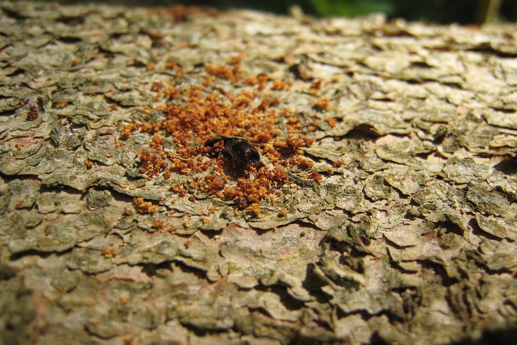 Borkenkäfer sind eine artenreiche Gruppe oft braun oder schwarz gefärbter Käfer, von denen sich viele Arten unter der Borke oder im Holz von Bäumen in selbstgebohrten Gängen fortpflanzen. © LFV / Borkenkäfer mit Bohrmehl