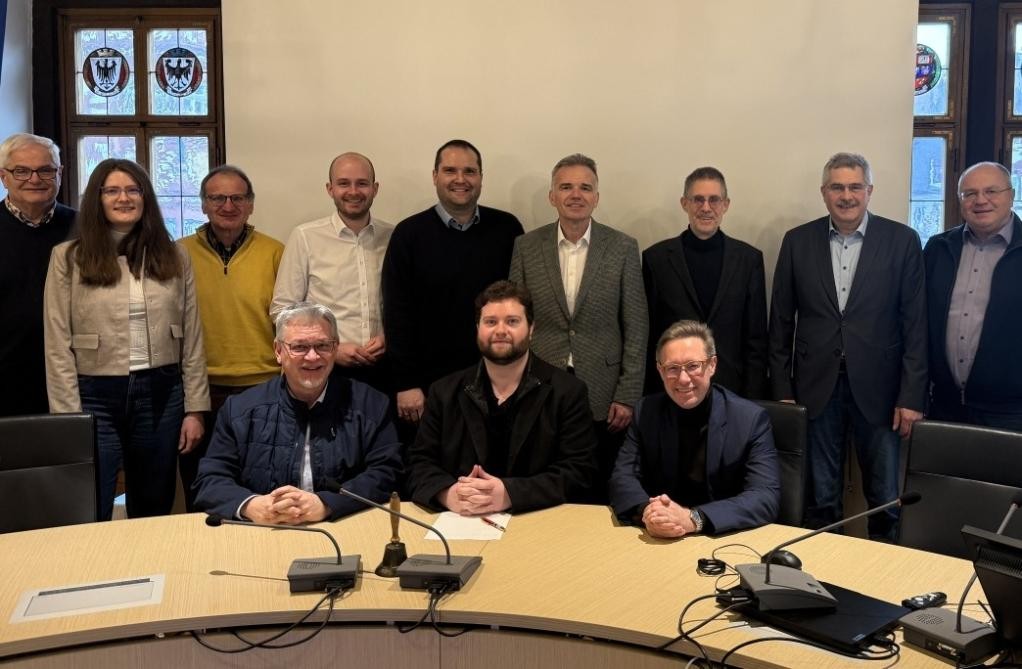 Der designierten Musikschulleiter Mathias Chladt (vorne), umrahmt vom 1. Vorsitzenden OB Julian Stipp (rechts) und stellvertretenden Vorsitzenden Mathias Haas (links). Dahinter Vertreter der Mitgliedsgemeinden und Musikschulleiter Martin Daab. (c) Stadt Mosbach
