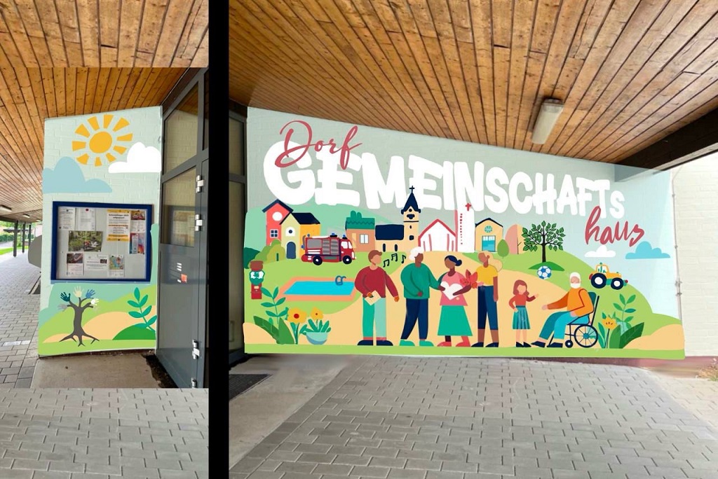 Das Dorfgemeinschaftshaus Reichenbuch ist seit vielen Jahren Zentrum des örtlichen Lebens: Hier finden Sport, Feste, Vereinsaktivitäten und Kindergartenbetrieb statt. In den vergangenen Jahren wurde bereits viel investiert – der Kindergarten St. Paulus wurde umfassend saniert, das Gebäude modernisiert, der Hof neu gepflastert und der Eingangsbereich barrierefrei gestaltet. Nun folgt mit dem Mural ein weiterer Schritt zur Verschönerung.