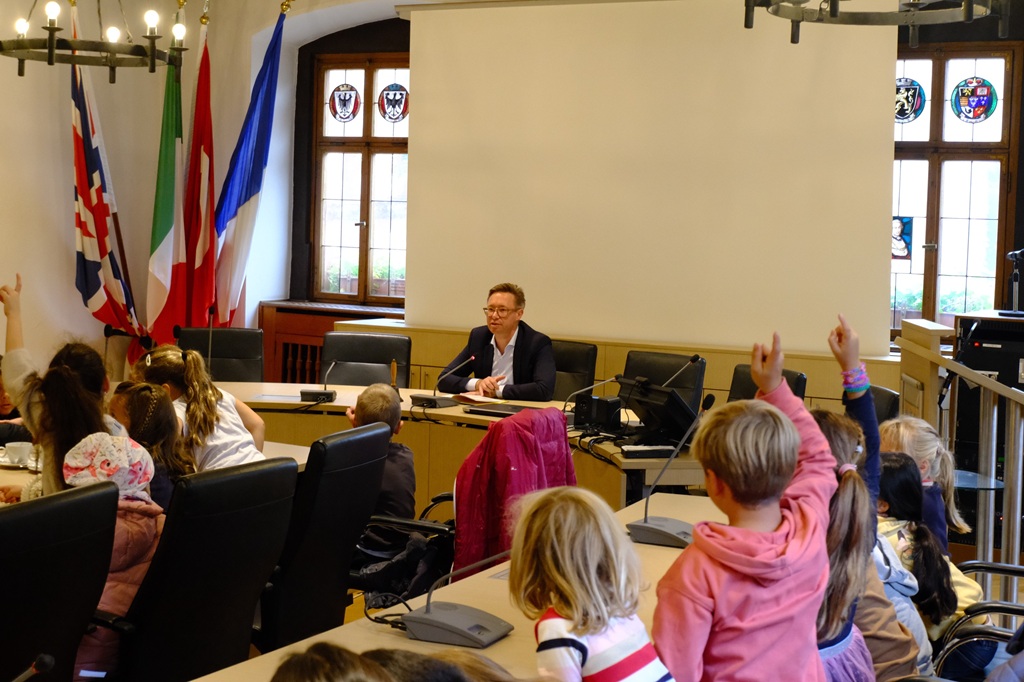 Nach einer herzlichen Begrüßung erzählte Stipp den Kindern, was im Rathaus alles passiert, und beantwortete viele neugierige Fragen: „Wie wird man eigentlich Oberbürgermeister?“, „Wie groß ist Mosbach?“ oder „Darf man hier wohnen?“ – die kleinen Besucherinnen und Besucher wollten es genau wissen.