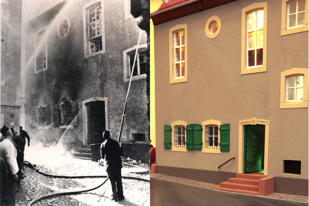 Links ist eine Aufnahme aus dem Jahre 1938 : Die Mosbacher Synagoge steht in Brand. Im rechten Bildausschnitt ist das nachgebaute Modell im gleichen Blickwinkel dargestellt. ©Stadt Mosbach