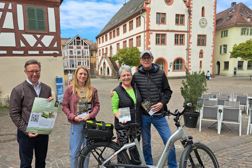 Einen E-Bike-Führer haben Birgit Dallinger und Robert Becker in zweijähriger Arbeit erstellt. Gemeinsam mit OB Julian Stipp und Tourist Info-Leiterin Angela Kastner wurde der Führer mit 13 Touren der Öffentlichkeit vorgestellt. (c) Stadt Mosbach