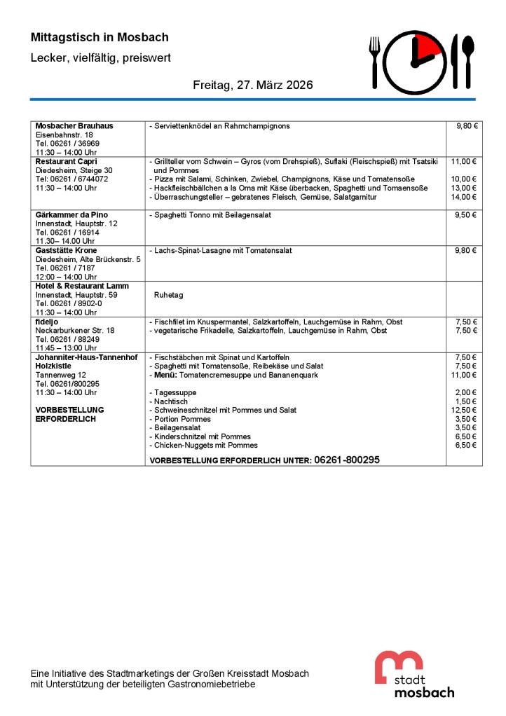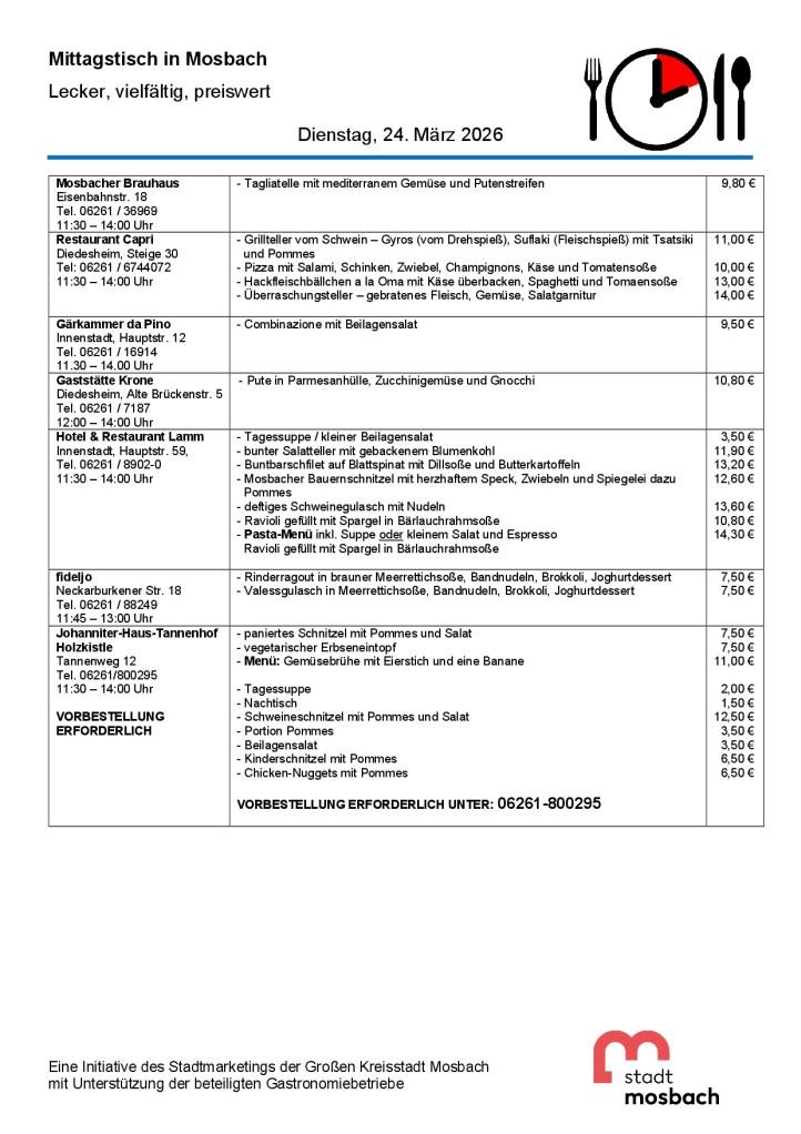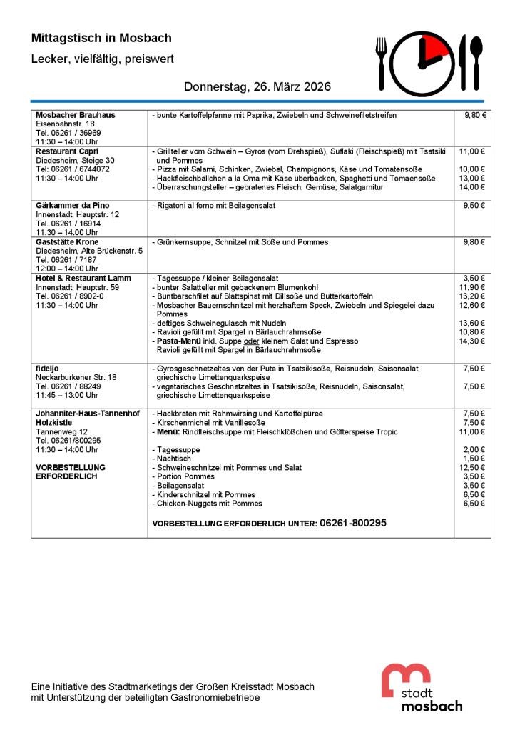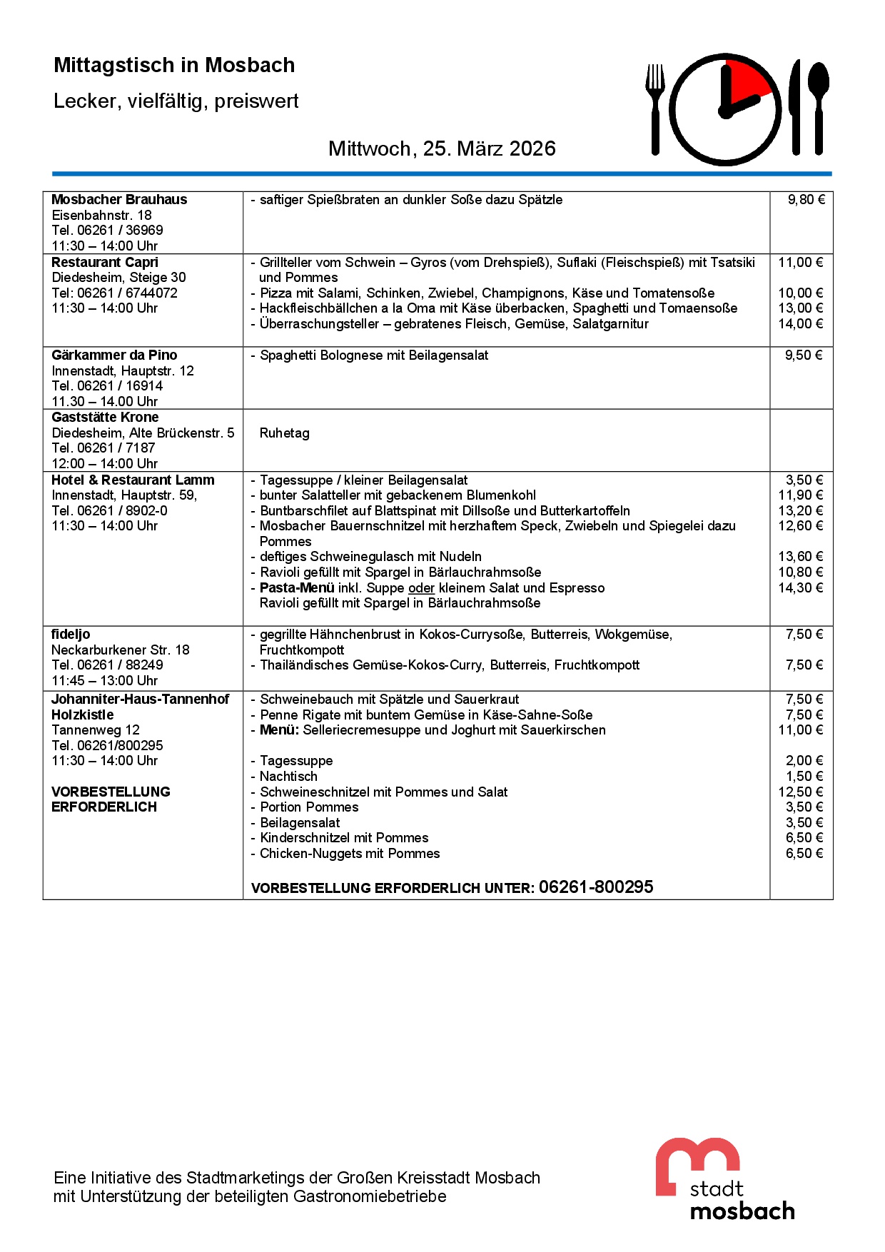 Finden Sie mit unserem Serviceangebot schnell und einfach den für Sie passenden Mittagstisch in Mosbach. Leckere und preiswerte Gerichte für die unterschiedlichsten Geschmäcker - übersichtlich und tagesaktuell in allen teilnehmenden Restaurants in der Innenstadt und den Stadtteilen.