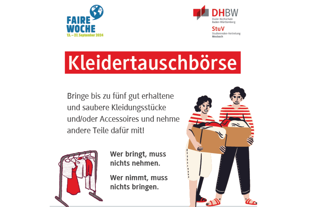 Studierende der DHBW Mosbach veranstalten am 17.September von 16 bis 19 Uhr im Rathaussaal eine Kleidertauschbörse. Dort können bis zu fünf gut erhaltene Kleidungsstücke mitgebracht „und dafür andere Kleidungsstücke mitgenommen werden. Gerne kann auch nur etwas abgegeben oder nur etwas mitgenommen werden. Umkleidemöglichkeiten sind vorhanden.