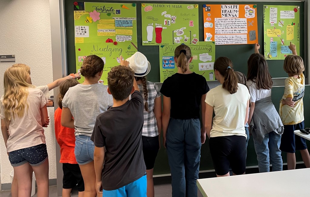 Schüler*innen des Auguste-Pattberg-Gymnasiums stellen ihre in der Umweltwoche vor den Sommerferien erarbeiteten Plakate aus. Im Workshop zum Thema „Nachhaltige Ernährung“ haben sich die jungen Menschen mit den Themen Fleischkonsum versus Pflanzenpower, Reste / Müllvermeidung / (un-)verpackt / Mehrweg, Bio / saisonal / regional, Fairtrade und Nudging beschäftigt.
